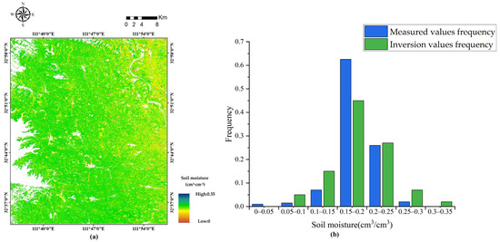 Results of SSM inversion in the study area on 23 September 2021: (a) spatial distribution of inverted SSM; (b) frequency distribution of inverted and measured SSM.