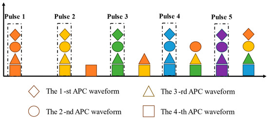 Taking and as an example, Figure 4 depicts the relationship between the four APC waveforms with third-order Doppler ambiguity in the Doppler domain.