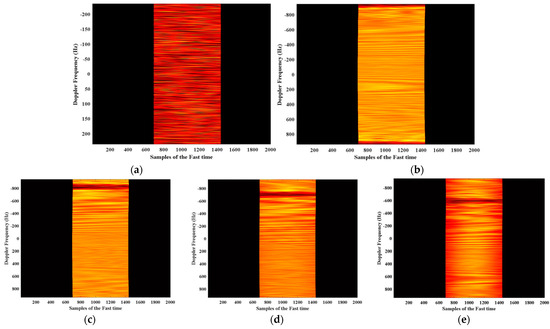 The echoes in range-Doppler domain of different APC waveforms before and after azimuth DBF. (a) The two-dimensional ambiguous echo. (b) The 1-st APC waveform echo after azimuth DBF. (c) The 2-nd APC waveform echo after azimuth DBF. (d) The 3-rd APC waveform echo after azimuth DBF. (e) The 4-th APC waveform echo after azimuth DBF.