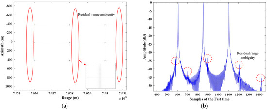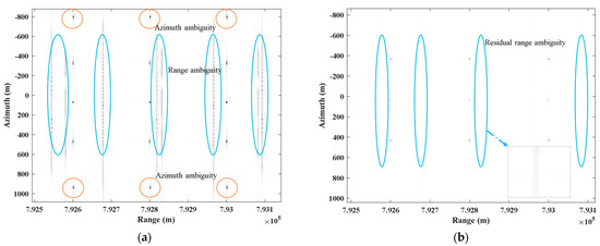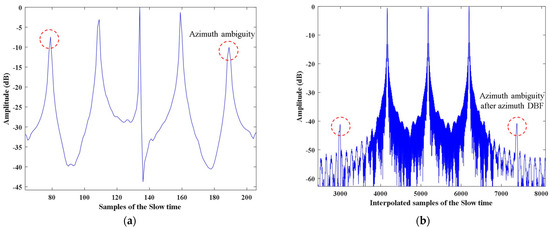 The numerical analysis results of the two-dimensional ambiguity suppression ability in Figure 7 are shown in Figure 8 and Figure 9. Figure 8a,b analyzes the range ambiguity suppression ability of the azimuth DBF. Compared to two-dimensional ambiguous echo, the azimuth DBF proposed in this article achieves about 25 dB of range ambiguity suppression effect. However, there is still minor residual range ambiguity. Figure 9a,b exhibits the analysis of the azimuth ambiguity suppression ability of azimuth DBF. After azimuth reconstruction, azimuth DBF yields about 35 dB of azimuth ambiguity suppression effect, basically achieving the goal of two-dimensional ambiguity suppression.