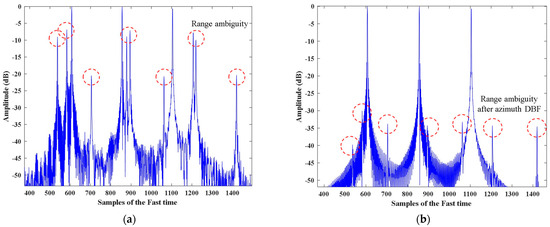 The numerical analysis of the range ambiguity suppression ability of azimuth DBF of the proposed scheme. (a) The range profile of the two-dimensional ambiguous echo imaging result. (b) The range profile of the imaging result after azimuth DBF.