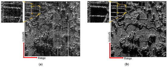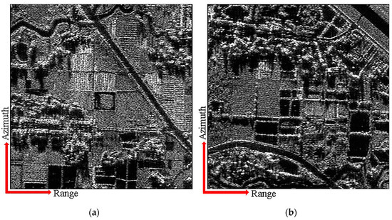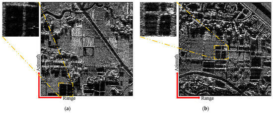 Figure 14a,b illustrates the imaging results of the distributed targets using the conventional and proposed schemes for the same range-ambiguous sub-region, respectively. In contrast with the conventional scheme, the proposed scheme uses APC waveforms to convert range ambiguity into azimuth ambiguity, and azimuth DBF simultaneously suppresses azimuth ambiguity and range ambiguity, possessing a superior range ambiguity suppression ability. Furthermore, the proposed scheme uses azimuth DBF to suppress range ambiguity, which can abate the impact of height fluctuations in the range direction on the ability to suppress range ambiguity.