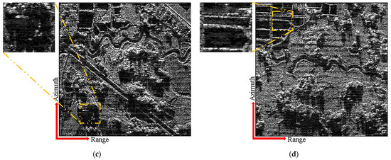 Figure 7a depicts the direct imaging result of two-dimensional ambiguous echo in the comparative experiment. It indicates that the traditional imaging method cannot directly image two-dimensional ambiguous echo, leading to azimuth ambiguity and range ambiguity. This article takes the nearest range sub-region as an example to compare the effects of ambiguity suppression. Figure 7b shows the suppression result of azimuth ambiguity and range ambiguity after azimuth DBF using the proposed scheme. It can be seen that the proposed scheme converts range ambiguity suppression into azimuth ambiguity suppression. By separating the echoes of APC waveforms through azimuth DBF, the azimuth reconstruction of APC waveform echoes is achieved while suppressing azimuth ambiguity and massive range ambiguity.