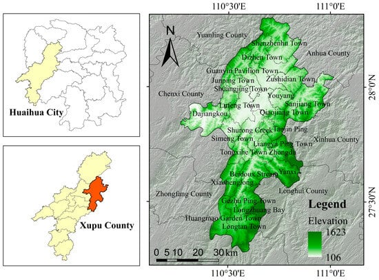Xupu County is located in the western part of Hunan Province and the northeastern part of Huaihua City, on the middle reaches of the Yuan River. It shares borders with Dongkou County and Hongjiang City to the south, Yuanling County and Anhua County to the north, Xinhua County and Longhui County to the east, and Chenxi County and Zhongfang County to the west. Its geographical coordinates range from 110°15′E to 111°01′E and 27°19′N to 28°17′N, covering a total area of 3438 km2, as shown in Figure 2. It Is In the mid-low mountains and hills of western Hunan, with a subtropical humid monsoon climate—hot, rainy summers; mild, moist winters; and heavy spring-summer rainfall. The region has significant climatic variations, microclimates, and vertical climate differences. Its geology, with frequent structural movements and fault structures, makes it prone to landslides. The nature of strata and rock formations has a profound impact on the structure of slopes and the types of accumulated layers, making it a key factor controlling slope stability. Xupu County has ancient and complex geological conditions, with strata from the Proterozoic, Lower Paleozoic, Upper Paleozoic, Mesozoic, and Cenozoic eras all present. Among them, the stratigraphic units of the Upper Sinian System of the Lower Paleozoic Era, the Doucun Formation, and the Dengying Formation are the most widely exposed in the study area. This study focuses on Xupu’s landslide susceptibility, using 111 landslide sites as primary data for model assessment.