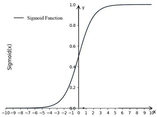 The logistic regression model is a predictive model used for binary or multiclass classification [,]. Its principle involves calculations through functions such as Sigmoid. The schematic diagram of the Sigmoid function is shown in Figure 3. In this paper, the levels of various landslide-influencing factors are treated as independent variables, while the occurrence or absence of landslides is considered the dependent variable []. Let ‘P’ represent the probability of a landslide occurring, with its value ranging between [0, 1]. The expression is as follows: