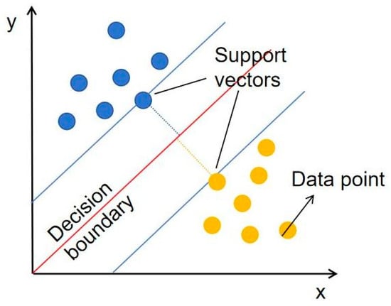 The Support Vector Machine (SVM) is a powerful supervised learning technique utilized for both linear and non-linear classification and regression tasks. Drawing from the concept of Structural Risk Minimization in statistical learning theory, SVM employs kernel methods to project data from an original finite-dimensional space into a more expansive, higher-dimensional space. Within this augmented space, SVM identifies the optimal hyperplane for classification, which efficiently discriminates between various data categories, maximizing the margin between different classes. This strategy is particularly advantageous for problems that are not linearly separable in their original dimensionality. The schematic diagram of the principle of the Support Vector Machine model is shown in Figure 4.