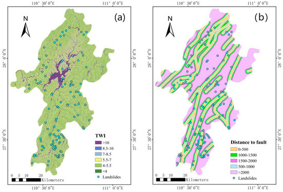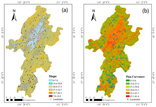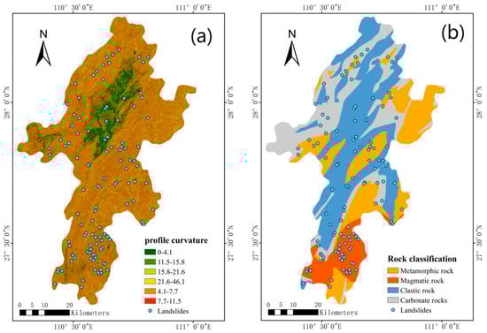 In this research, elevation, geological, and remote sensing data were collected for Xupu County. The elevation data were obtained from the ASTER GDEM digital elevation model with a 30 M resolution available in the geospatial data cloud; geological data were sourced from the 1:250,000 scale geological maps provided by the Geological Science Data Publication System of the China Geological Data Repository; remote sensing data were acquired from the Landsat 8–9 OLI/TIRS C2 L2 dataset in the geospatial data cloud. Additionally, regional landslide disaster data were derived from the Geological Disaster Survey of Xupu County, Hunan Province, conducted by the Chinese Academy of Sciences’ Institute of Resources and Environment. The datasets were processed using ArcGIS 10.8 software: (1) Extracting factors such as rock groups, distance to faults, and distance to roads from the 1:250,000 geological maps; (2) Utilizing elevation data to derive factors like slope, aspect, terrain ruggedness, profile curvature, plan curvature, distance to rivers, and the topographic wetness index; (3) Employing remote sensing data to extract land use types and vegetation cover factors. Among them: the distance from rivers, the distance from faults, and the distance from water systems are measured using the equidistant method, while the other factors are assessed using the natural break point method. The classification results for these different evaluation factors are illustrated in the accompanying Figure 5, Figure 6 and Figure 7.