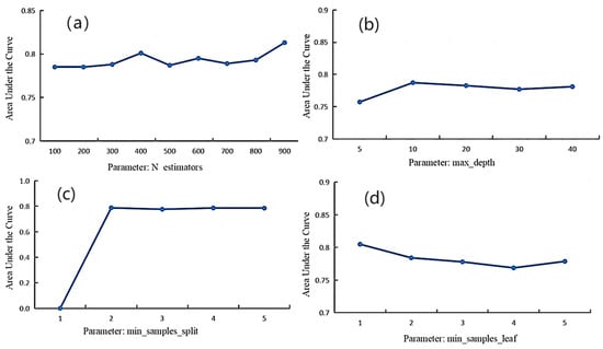 The hyperparameters of Random Forest (RF) include n_estimators (the number of decision trees), max_depth (the depth of each decision tree), min_samples_split (the minimum number of samples required to split an internal node), and min_samples_leaf (the minimum number of samples required to be at a leaf node). The meticulous adjustment of these parameters aims to achieve an optimal balance between model performance and computational efficiency. The optimization of these parameters is crucial for ensuring the accuracy and generalization capability of the Random Forest model in landslide susceptibility assessments. The tuning process for RF model parameters is depicted in Figure 9, and a comprehensive list of parameters is provided in Table 6.