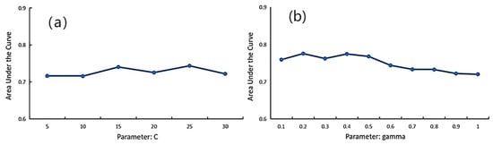Tuning process for Support Vector Machine model parameters, (a) C, (b) gamma.