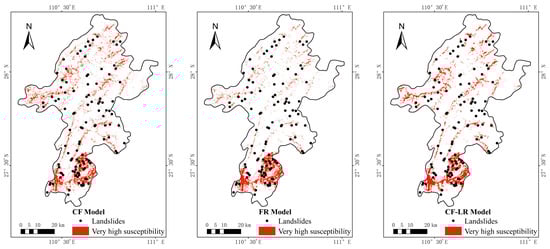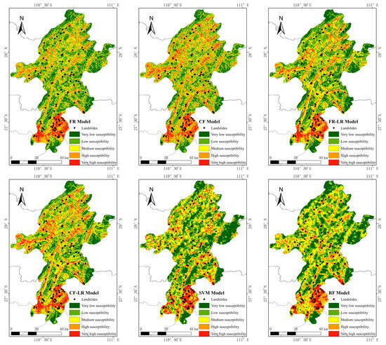 GIS spatial analysis tools were employed to derive susceptibility evaluation results for the CF + LR and FR + LR models by overlaying layers of deterministic coefficient and frequency ratio values, weighted according to their respective weights. Similarly, for the RF and SVM models, landslide susceptibility evaluation results were produced through a weighted overlay of probabilities calculated by machine learning models. The predicted probabilities of landslides for all models span from 0 to 1. The prediction results of the six models were classified into five levels using the natural break method: very low susceptibility (0–0.3), low susceptibility (0.3–0.4), moderate susceptibility (0.4–0.5), high susceptibility (0.5–0.65), and very high susceptibility (0.65–1), as depicted in Figure 10. The concentration of existing landslide disaster points in the very high and high susceptibility zones as determined by the models suggests the validity of the susceptibility zoning outcomes of these models.