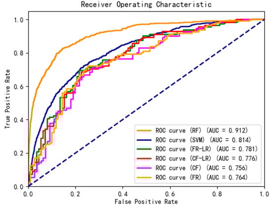 The predictive models’ ROC curves are depicted in Figure 11. From the ROC curves, the following Area Under the Curve (AUC) values can be calculated: CF model AUC = 0.756, FR model AUC = 0.764, CF-LR model AUC = 0.776, FR-LR model AUC = 0.781, SVM model AUC = 0.814, and RF model AUC = 0.912. The accuracy of both the RF and CF models slightly improved after coupling with the LR model, indicating that the multi-model coupling has a better predictive effect than single models. With all four models’ AUC values falling within the 0.7–1 range, this suggests good overall accuracy for the models, making them reliable for providing references in landslide susceptibility zoning of the study area. Among them, the Random Forest model exhibits the highest accuracy in predicting landslide susceptibility zoning in the study area.