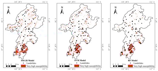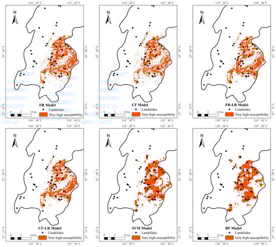 Model adaptability analysis assesses a model’s fitness for particular contexts and applications by examining its output. Due to Xupu County’s complex geology and heavy rainfall, it is susceptible to landslides. This study focuses on the extremely high susceptibility zones from six zoning maps to gauge model adaptability. The performance of these models in predicting landslides within these zones is analyzed for practical utility. The identified extremely high susceptibility areas are depicted in Figure 12, and the corresponding landslide occurrence counts are summarized in Table 7.