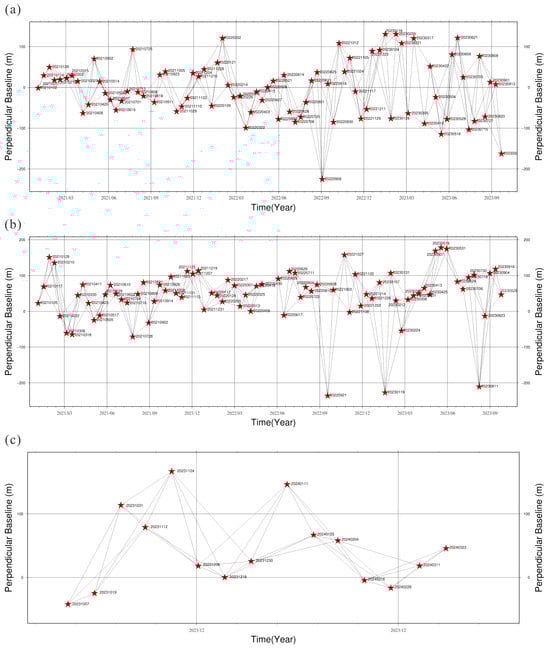Spatial and temporal baseline configuration of Sentinel-1 datasets. (a) Ascending (Track 12) images prior to the disaster; (b) descending (Track 48) images prior to the disaster; (c) descending (Track 48) images after the disaster.