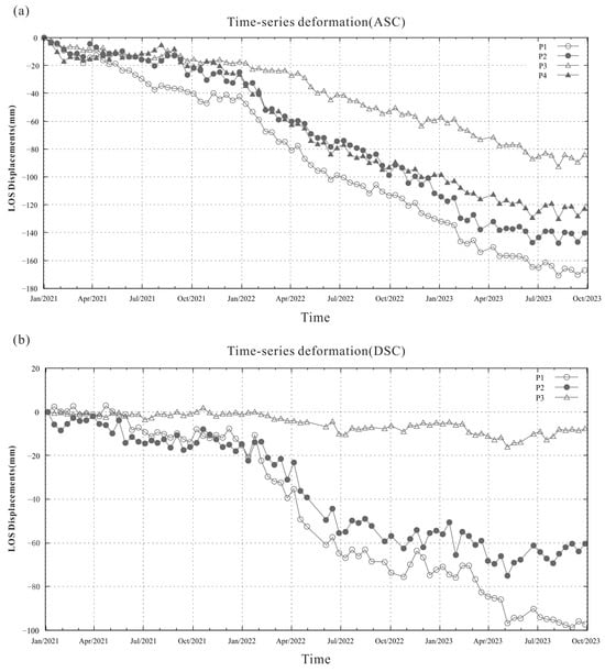 Time-series deformation of selected points (P1–P4) before the disaster. (a) Ascending (Track 12); (b) descending (Track 48). There is no deformation point near P4 in the deformation results obtained from the descending images.
