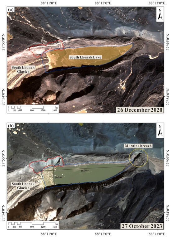 GF-2 images of South Lhonak Lake and its surroundings. (a) Prior to the GLOF; (b) after the GLOF.