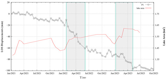 The correlation between the time-series deformation of point P1 derived from the descending images of Sentinel-1 before the disaster and the variation in the area of South Lhonak Lake from January 2021 to July 2023.