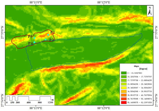 Figure 12 illustrates the slope map of the study area computed using NASADEM HGT v001. The dashed blue line represents the pre-disaster lake contour outlined using Landsat 8 images acquired on 25 June 2023, while the solid red line delineates the extent of the landslide. Analysis of deformation results derived from the ascending images reveals a significant acceleration at point P1 from May to July 2021, surpassing the velocities observed at other selected points. Notably, P1 exhibits the highest deformation rate among the four selected points (P1–P4). Furthermore, the slope map depicted in Figure 12 highlights that within the landslide area, the region housing point P1 exhibits the steepest slope.