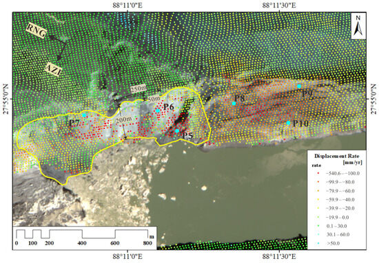 The LOS average deformation rate around South Lhonak Lake after the GLOF was calculated using the Sentinel-1 SLC data from October 2023 to March 2024 from the descending track. The yellow line delineates the landslide area, and points P5–P10 were selected for further analysis of the time-series deformation within this area after the GLOF.
