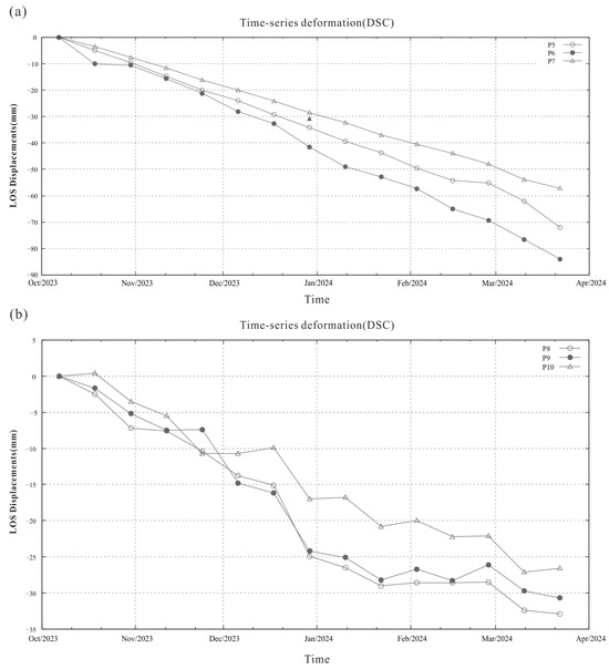 Time-series deformation of selected points obtained from descending images after the GLOF. (a) P5–P7; (b) P8–P10.