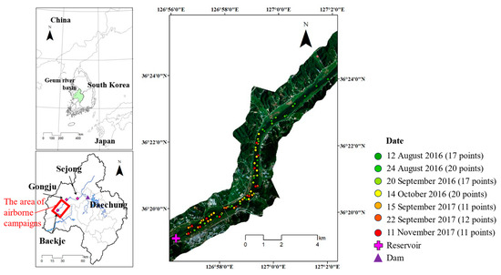 To monitor the BJR, hyperspectral imaging and water sampling from seven campaigns on four occasions in 2016 and three occasions in 2017 were conducted. For hyperspectral imaging, an AisaFENIX hyperspectral sensor (AISA Aero Survey Co., Ltd., Kawasaki, Japan) was used, which has a spectral resolution of 400–970 nm at 4–5 nm intervals and a spatial resolution of 2 m. The airborne campaigns were conducted for 2 to 3 h starting at 8:30 a.m. at an altitude of 3 km. Field sampling commenced at approximately 8:30 a.m. as well. Water sampling and in situ reflectance data were collected over a 3 h period at the monitoring stations. A total of 11–20 points were sampled for each monitoring event. The field reflectance for atmospheric correction was obtained using a FieldSpec Handheld2 spectroradiometer (ASD Inc., Boulder, CO, USA) in the wavelength range of 325–1075 nm. The MODTRAN code was developed at Science Inc. (Santa Monica, CA, USA), and the Air Force Research Laboratory was utilized to generate atmospheric correction parameters and subsequently calculate the surface reflectance of the hyperspectral images. The relationship between the atmospheric corrected reflectance and field reflectance through MODTRAN 6 presented in Pyo et al. [20] showed that the NSE was higher than 0.8 and the RMSE value was lower than 0.0034 sr−1, and the parameter-related information is shown in Section A in the Supplementary Materials.