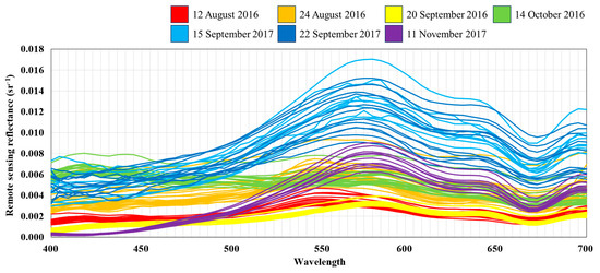 The airborne hyperspectral image used as an input variable had 127 reflectance in the 400–970 nm range, but 66 bands in the 400–700 nm range of visible light were used. After imaging the entire BJR using a hyperspectral device mounted on an aircraft, atmospherically corrected reflectance values were obtained using MODTRAM 6. Figure 2 shows airborne hyperspectral values from 107 water sampling points from 12 August 2016 to 11 November 2017. Correlation analysis was performed to investigate the relationship between and single-band reflectance , and the final input variable was constructed by estimating the optimal value in the region of high correlation.