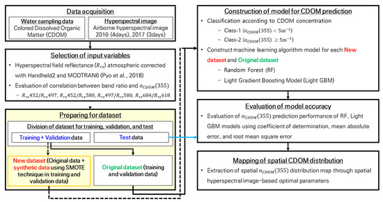Chromophoric dissolved organic matter (CDOM) is a mixture of various types of organic matter and a useful parameter for monitoring complex inland surface waters. Remote sensing has been widely utilized to detect CDOM in various studies; however, in many cases, the dataset is relatively imbalanced in a single region. To address these concerns, data were acquired from hyperspectral images, field reflection spectra, and field monitoring data, and the imbalance problem was solved using a synthetic minority oversampling technique (SMOTE). Using the on-site reflectance ratio of the hyperspectral images, the input variables Rrs (452/497), Rrs (497/580), Rrs (497/618), and Rrs (684/618), which had the highest correlation with the CDOM absorption coefficient aCDOM (355), were extracted. Random forest and light gradient boosting machine algorithms were applied to create a CDOM prediction algorithm via machine learning, and to apply SMOTE, low-concentration and high-concentration datasets of CDOM were distinguished by 5 m−1. The training and testing datasets were distinguished at a 75%:25% ratio at low and high concentrations, and SMOTE was applied to generate synthetic data based on the training dataset, which is a sub-dataset of the original dataset. Datasets using SMOTE resulted in an overall improvement in the algorithmic accuracy of the training and test step. The random forest model was selected as the optimal model for CDOM prediction. In the best-case scenario of the random forest model, the SMOTE algorithm showed superior performance, with testing R2, absolute error (MAE), and root mean square error (RMSE) values of 0.838, 0.566, and 0.777 m−1, respectively, compared to the original algorithm’s test values of 0.722, 0.493, and 0.802 m−1. This study is anticipated to resolve imbalance problems using SMOTE when predicting remote sensing-based CDOM. It is expected to produce and implement a machine learning model with improved reliable performance.