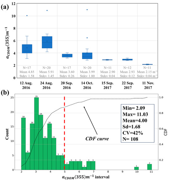 Distribution and histogram of CDOM data: (a) daily distribution of CDOM data; (b) histogram and section count of CDOM data and 5 m−1, which is the standard for class distinction, is indicated by a red line.
