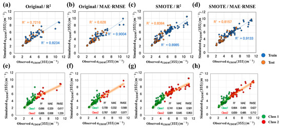Correlation analysis between observed and simulated calculated using random forest: (a) training/testing selected as R2 in the original dataset; (b) training/testing selected as MAE/RMSE in the original dataset; (c) training/testing selected as R2 in the new dataset; (d) training/testing selected as MAE/RMSE in the new dataset. (a–d) are reclassified into Class 1 () and Class 2 (), respectively, and the correlation and performance for each class are calculated and expressed as (e–h). The blue line represents the trend line in Train dataset, and the orange line represents the trend line in test dataset in (a–d). The red line represents the trend line in Class 2, and the green line represents the trend line in Class 1 in (e–h).