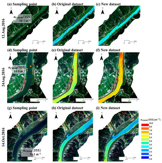 Spatial distribution analysis of at three points in the high-concentration section using hyperspectral imaging: hyperspectral images of (a) 12 August 2016, (d) 24 August 2016, and (g) 14 October 2016. (b,e,h) showed the CDOM spatial distribution constructed through the random forest algorithm from the original dataset, and (c,f,i) showed the CDOM spatial distribution constructed through the random forest algorithm from the new dataset.