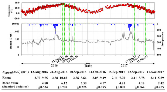 In Figure 9, rainfall, temperature, and discharge in the BJR station are compared to determine the spatial distribution trend of the high-concentration section, and the sampling date are indicated. In addition, the range, average, and standard deviation of in the entire BJR section are shown in a table. Prior to 12 August 2016, rainfall of 17.5 mm and 4.5 mm occurred on August 2 and August 6, respectively. Subsequent to August 6, a high value of was observed near the BJR, where organic matter was deposited due to a runoff of less than 100 CMS. It is judged that deteriorating values appear in the riverside from the waterside area, and the overall range is wide, ranging from 2.70 m−1 to 9.55 m−1. There was no rainfall between August 6 and August 24. The discharge was limited at 36.1–87.2 CMS, and high temperatures of 34–36.2 °C persisted during this period, resulting in a high . On October 14, 2016, it was observed that the at the waterside increased due to a low runoff of 47.5–63.5 CMS from October 11 following 21.5 mm of rainfall on October 8. The was the highest when the Chl-a bloom collapsed, and high residual amounts appeared. Furthermore, there was a delay between the peak values of Chl-a and [49]. This explains why CDOM showed the highest distribution on August 24, which differed from previous studies [20,50] where Chl-a was highest on August 12.
