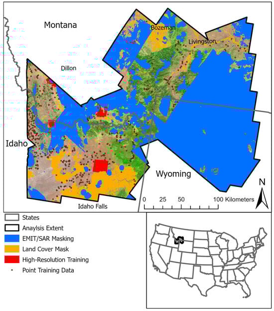 A land cover mask targeted to omit water bodies, urban areas, cultivated croplands, and perennial snow/ice [] was applied to our mapping results, as these areas are untrained. The land cover mask was identified using National Land Cover Database 2021 [] land cover classes and 2021 Cropland Data Layer []. Considering the land cover mask and masking applied to EMIT and SAR data, a total of 26,635 km2 was mapped in our analysis. The study area was defined based on the common area available in the selected SAR and EMIT datasets.