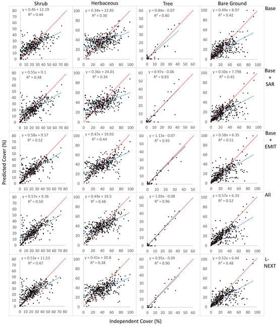 Scatterplots of independent validation (n = 399) for selected component cover predictions by model run. Line of best fit and 1-to-1 line indicated by dashed blue and solid red line, respectively. For improved visualization, the x and y ranges vary by plot. SAR = Synthetic Aperture Radar; EMIT = Earth Surface Mineral Dust Source Investigation; LNEXT = Landsat NEXT.