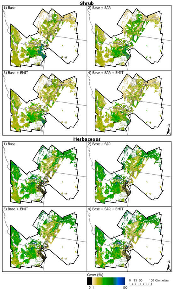 The following supporting information can be downloaded at: https://www.mdpi.com/article/10.3390/rs16132315/s1, Table S1. Independent variables used in the development of high resolution and all 30-m scale models used in this analysis. SAVI; Soil Adjusted Vegetation Index, NDBI; Normalized Difference Built-up Index, NDWI; Normalized Difference Water Index, NDVI; Normalized Difference Vegetation Index. The 6 bands included in Landsat composites were blue, green, red, near infrared, shortwave infrared 1, and shortwave infrared 2. Figure S1. Examples of model differences for shrub cover in a high elevation mountain valley with tree cover depicted as dark green in the Landsat composite. Image depicting common vegetation in the case study area (lower right) obtained from Google Earth. The base + SAR prediction displays confusion in the less dense, transitional forested areas, confusing some tree as shrub cover. Base + EMIT prediction shows a clear distinction in the boundaries between shrubs and trees but a flatter range of values, with reduced zeroes and higher values that are seen in the base run. The prediction using both SAR and EMIT is a good compromise showing a higher range of values and a better performance in the forested areas. Figure S2. Examples of model differences for herbaceous cover in relatively intact sagebrush site at moderate elevation. Drone image covering case study area (lower right) obtained from Google Earth. Relative to the base run, including SAR results in stark increase in the herbaceous cover overall as well as an increase in the range of values which help identify patches of bare ground and roads. The Base + EMIT model lowers the herbaceous values in favor of shrub/sagebrush while keeping the range of values closer to that of the base prediction.