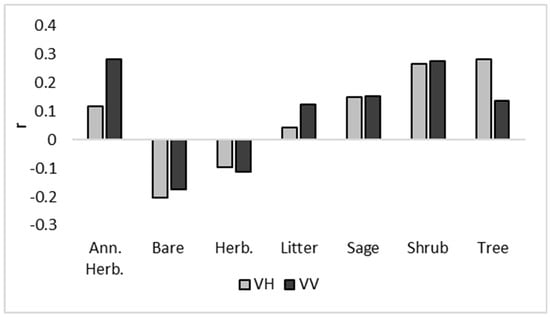 Correlation (r) between Rangeland Condition Monitoring Assessment and Projection (RCMAP) high-resolution training data and Synthetic Aperture Radar (SAR) horizontal transmit and vertical receive (VH)/vertical transmit and vertical receive (VV) data at n = 60,000 pixels.