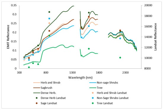 Average spectral profiles of important rangeland targets (see Methods Section for classification details) based on high-resolution Rangeland Condition Monitoring Assessment and Projection (RCMAP) data. Line data reflect Earth Surface Mineral Dust Source Investigation (EMIT) profiles, and points of the same color represent Landsat.