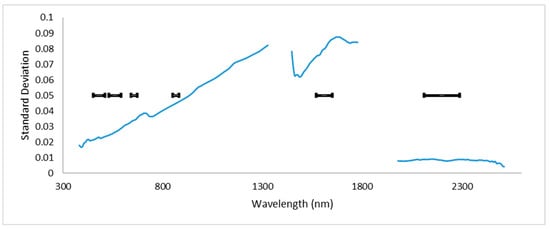 Separability of rangeland classes plotted in Figure 5 as measured by the standard deviation among spectral profiles across the classes at each Earth Surface Mineral Dust Source Investigation (EMIT) band. Width of Landsat band ranges (bands 2–7 used in Rangeland Condition Monitoring Assessment and Projection [RCMAP] analysis) are plotted in black.