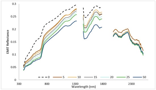 Average spectral profile from Earth Surface Mineral Dust Source Investigation (EMIT) by shrub 5% cover bins (color) in Rangeland Condition Monitoring Assessment and Projection (RCMAP) high-resolution training sites. Some bins are omitted for clarity. We removed pixels with >0% tree cover and ≥20% herbaceous cover from this analysis. All species of shrub are included.