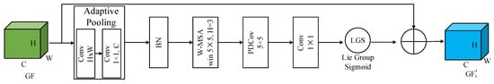 where represents the input feature map, represents the previous input feature map, represents the feature map, represents the adaptive pooling, represents the batch normalization, represents the windows multi-head self-attention, and represents the parallel dilated convolution with convolution kernel. represents a convolution with a convolution kernel of , and represents a Lie Group Sigmoid activation function. The global feature information extracted from the above will be input into the global and local feature fusion module.