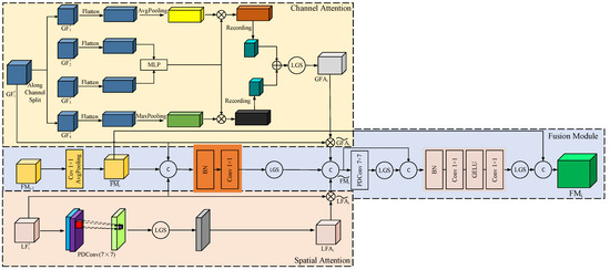 where represents the feature map generated in the previous stage of fusion; represents the feature map generated after the fusion; represents the feature map after the fusion of channel dimensions, that is, the element-wise multiple of the feature map before the channel attention operation and the feature map obtained after the channel attention mechanism is used; represents the feature map after the fusion of spatial dimensions, that is, the element-wise multiple of the feature map before the spatial attention operation and the feature map obtained after using the spatial attention mechanism; represents the concatenation operation; represents the batch normalization; and represents the GELU activation function.