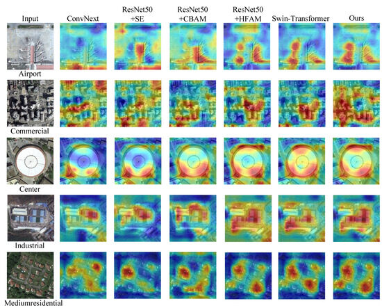 - The model with an added attention mechanism has higher classification accuracy compared to traditional models without an added attention mechanism. For example, the ResNet50+CBAM [1] model improved by 0.13% compared to the ResNet50 [62] model, and the VGG16+HFAM [1] model improved by 6.25% compared to the VGG-VD-16 [10] model. The experimental results verified the positive role of the attention mechanism in scene classification.