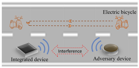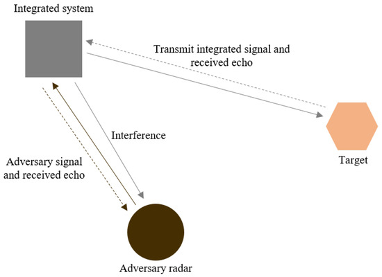 In the context of electronic warfare confrontation [34], there are various forms of adversarial interference between devices. As an illustration, consider the adversary radar transmitting the typical linear frequency modulation (LFM) signal. To attain both detection and jamming capabilities, our integrated device chooses a noise frequency modulation (NFM) signal within the same frequency band for target detection while concurrently interfering with the adversary radar. Then the working scenario of the integrated system considered in this paper is shown in Figure 1. In this scenario, since our signal and the adversary signal are on the same frequency to achieve the interference effect, the echo received during detection will contain the adversary radar signal. This will cause strong direct waves to affect our detection, thus reducing our detection performance. Therefore, the signal received by our integrated device includes not only the echoes reflected from the target for detection but also the direct wave impact formed by the adversary radar transmission signal. As for the adversary radar, the received signal includes the echoes reflected from our device and the interference caused by our device’s integrated signal transmission.