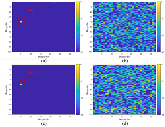 To demonstrate the detection and interference performance of the integrated signal, we compare the range-Doppler maps of the adversary radar and our integrated device before and after being disturbed by the opponent’s transmitting signal. During the simulation, the Gaussian noise is added to the echoes of both parties with −10 dB signal-to-noise ratios (SNR). On the other hand, our transmitting NFM integrated signal and the adversary transmitting LFM signal are added to the opponent’s echoes respectively as direct wave interference, where the interference-to-signal ratios (ISR) are both set to 40 dB.