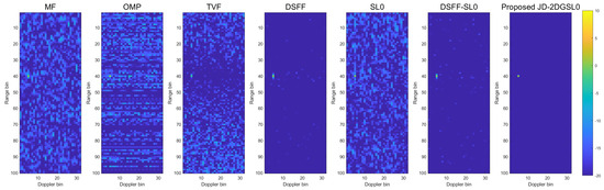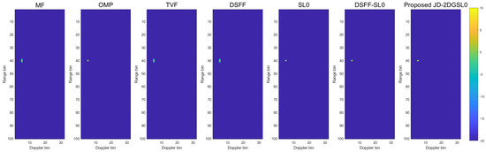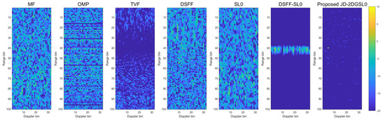 In the ideal situation of no noise and no adversary direct wave interference, the range-Doppler maps obtained after processing the echo of our integrated signal through various methods serve as a reference for subsequent analysis of other situations. The results are shown in Figure 7, and the target can be successfully detected only by the basic MF processing in the radar signal processing. The results obtained by further processing of the TVF and DSFF methods are almost identical to the results of the MF processing. Since each pulse of our integrated signal is not the same, higher side lobes will be formed in the range dimension after pulse compression processing. Some traditional methods (i.e., OMP, SL0, and DSFF-SL0) and the proposed JD-2DGSL0 method can further suppress the range dimension side lobe of the target point to obtain better detection performance even under ideal conditions without noise and interference.