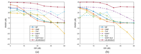 The main-to-sidelobe ratios (MSRs) curves of different methods as ISRs vary from 0 dB to 60 dB. (a) The range-dimensional main-to-sidelobe ratios (RMSRs) curves. (b) The Doppler-dimensional main-to-sidelobe ratios (DMSRs) curves.