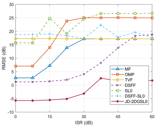 The root mean square errors (RMSEs) curves of different methods as ISRs vary from 0 dB to 60 dB.