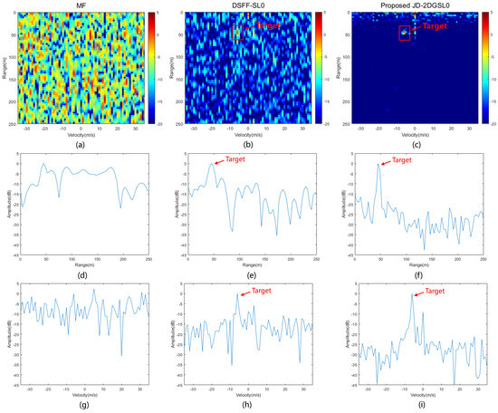 The signal received by our integrated system is processed by the basic MF method, the DSFF-SL0 method, and the proposed JD-2DGSL0 method, respectively. From Figure 15a, it is evident that our integrated system, when exposed to interference from the adversary radar’s co-frequency direct waves, fails to suppress the interference adequately for target detection through the basic matched filtering method. The range-Doppler maps obtained after processing with the DSFF-SL0 method and the proposed JD-2DGSL0 method are shown in Figure 15b,c, the interference can be successfully suppressed. However, it is worth noting that the DSFF-SL0 method still retains significant interference, which can impact the detection performance. Further analysis of the imaging results in the range and velocity dimensions for the target cells is presented. The results of the target’s main-to-sidelobe ratios under different processing methods are shown in Table 3. It can be observed in the presence of interference from the adversary direct wave, the basic matched filtering method exhibits significantly low main-to-sidelobe ratios, making it incapable of accurately extracting the target range and velocity information [see Figure 15d,g]. After processing with the DSFF-SL0 method, the main-to-sidelobe ratio in the range dimension increased by 6.86 dB, and the velocity dimension increased by 8.63 dB. However, there remains a significant amount of relatively high sidelobes, which can be seen in Figure 15e,h. After applying the proposed JD-2DGSL0 method, there is a significant improvement in the main-to-sidelobe ratios, with an increase of 21.44 dB in the range dimension and 20.51 dB in the velocity dimension. As a result, the high sidelobe interference is effectively suppressed, allowing for the accurate retrieval of target range and velocity information.