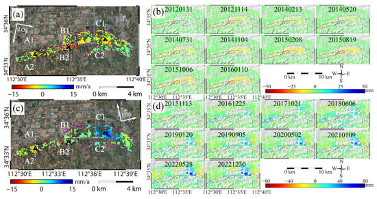 LOS deformation rate and cumulative deformation time series in the Longmen region from January 2012 to December 2022 from PS-InSAR: (a) LOS deformation rate obtained from Radarsat-2 data during 2012–2016; (b) time series of cumulative deformation from 2012 to 2016; (c) LOS deformation rate from Sentinel-1 during 2015–2022; and (d) time series of cumulative deformation from 2015 to 2022; A1-A2, B1-B2, and C1-C2 are the section lines drawn in Figure 5 (please note the different ranges of color bars in subplots for visualization).
