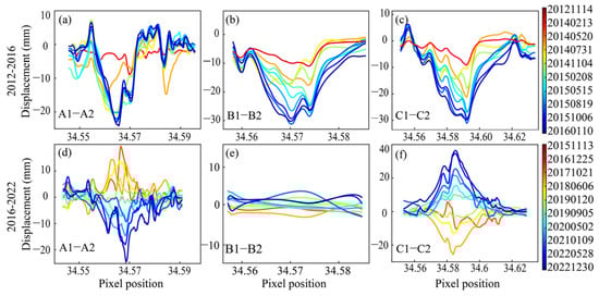 Cumulative deformation profiles A1-A2, B1-B2, and C1-C2 in Longmen mining area, Zhengxingsu mining area, and Changcun mining area. The location of the section lines A1-A2, B1-B2, and C1-C2 are shown in Figure 4: (a) A1-A2 in 2012–2016; (b) B1-B2 in 2012–2016; (c) C1-C2 in 2012–2016; (d) A1-A2 in 2016–2022; (e) B1-B2 in 2016–2022; and (f) C1-C2 in 2016–2022.