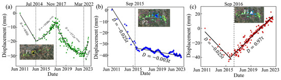 To better describe the deformation evolution in the Longmen mining area, we selected the feature points P1-P3 and delineated the cross-profiles A1-A2, B1-B2, and C1-C2 (Figure 4). The Longmen mine area experienced three transition periods as subsidence at 10 mm/year from January 2012 to June 2014. Subsequently, from July 2014 to October 2017, the area underwent uplift at a rate of 4 mm/year. From November 2017 to February 2022, the mining area transformed to subsidence again, accruing a cumulative subsidence of approximately 22 mm. Subsequent to March 2022, the deformation reverted to uplift. However, there is only a single deformation transition within the Changcun mining area in September 2016, when a rate of 8 mm/year subsidence changed to a 12 mm/year uplift (Figure 5 and Figure 6c). In contrast to the transition in the Longmen and Changcun mines, the Zhengxingsu mine experienced a two-stage subsidence, with a significant deceleration measured from 6 mm/year to 2 mm/year in June 2015 (Figure 5 and Figure 6b).