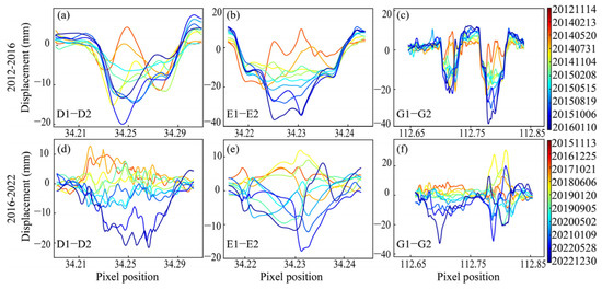 Cumulative deformation profiles D1-D2, E1-E2, and G1-G2 in Xiadian mining area. The location of section lines D1-D2, E1-E2, and G1-G2 are shown in Figure 7: (a) D1-D2 in 2012 to 2016; (b) E1-E2 in 2012–2016; (c) G1-G2 in 2012–2016; (d) D1-D2 in 2016–2022; (e) E1-E2 in 2016–2022; and (f) G1-G2 in 2016–2022.